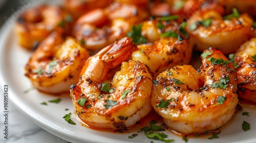 Close-up of succulent grilled shrimp in spicy sauce, garnished with fresh green herbs, exhibiting an appetizing texture and vibrant orange-red color on marble.