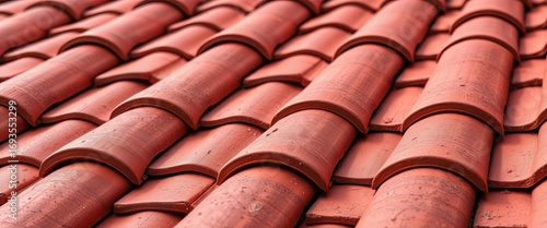Close-up of textured red clay roof tiles, showing surface detail and color variation, building material, shingles