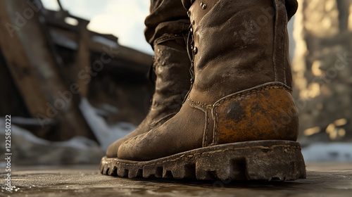 Close-up of the boots’ thick soles and weathered leather, highlighting their durability.