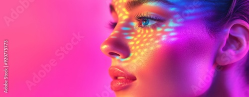 Close-up of the face of an attractive young woman illuminated by multicolored light patterns. Abstract futuristic portrait, digital painting, futuristic style. Banner with copy space.