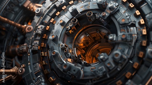 Closeup of the gear portal in an industrial engine, with visible gears and machinery, creating an immersive atmosphere.