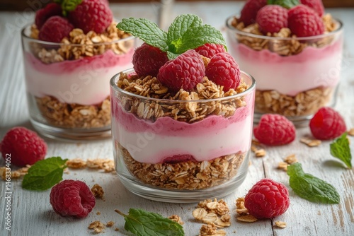 Close-up of three glass cups with layered granola, creamy yogurt mixed with raspberry puree, topped with fresh raspberries and green mint leaves, placed on a rustic wooden surface