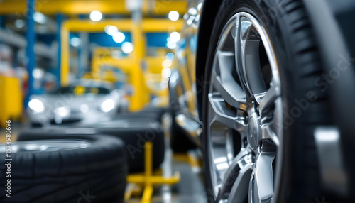 Close-up of tire with chrome rim in bright industrial setting with blurred tires and machinery.