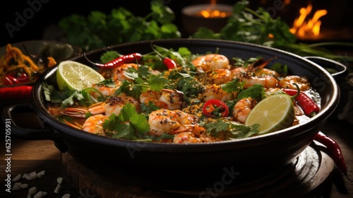 Close-up of Tom Yum Goong - a spicy shrimp soup, a delightful taste of Thailand. Generative AI.