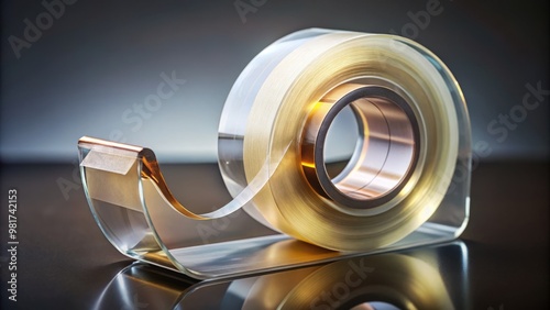 Close-up of transparent scotch tape unwinding from a dispenser, subtle gradient background, precise lines and subtle texture, high-contrast colors with clear reflections.
