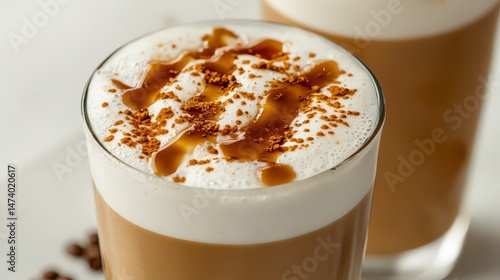 Close-up of two frothy cappuccinos with cinnamon spice topping and caramel drizzle served in clear glass cups on a white surface with a blurred background