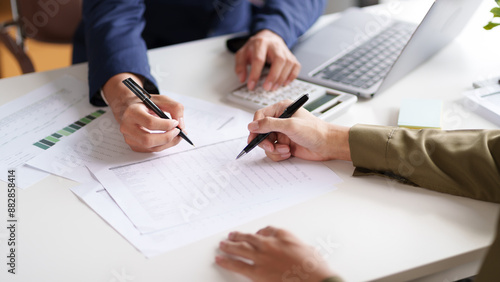 discussion, document, review, collaboration, closeup, hand, pen, desk, professional, office, work, meeting, analysis, paper, business, interaction, teamwork, planning, detail