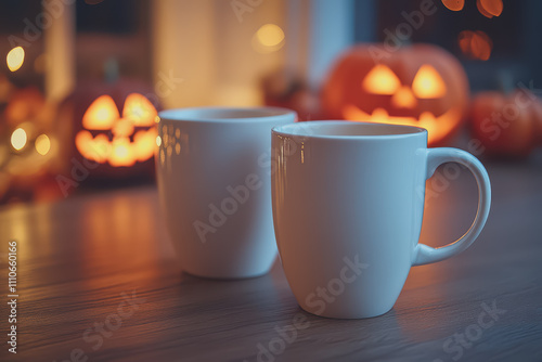 Closeup of two white coffee mugs sitting next to each other, the background is Halloween-themed.
