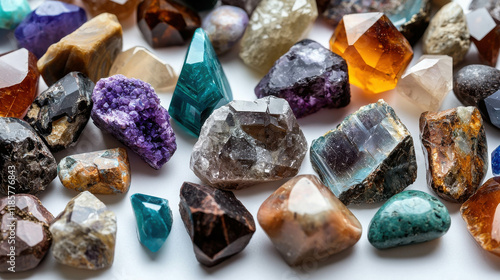 Close-Up of Various Natural Gemstones Displaying Unique Shapes and Colors