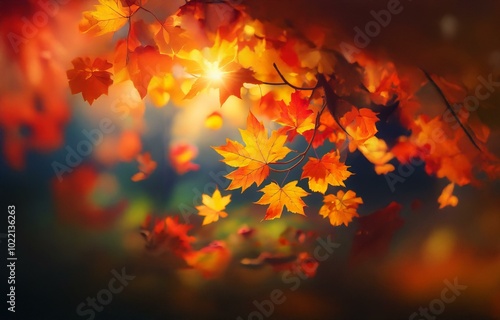 Close-up of vibrant autumn leaves with a soft, blurry background. Sun rays peek through the foliage.