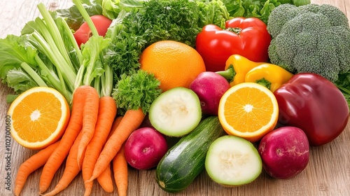 Close-up of vibrant fresh vegetables and fruits on wooden table, symbolizing healthy blood pressure foods, emphasizing natural nutrition and wellness.