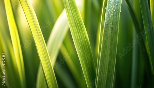Close-up of vibrant green grass blades, illuminated by soft sunlight with dewdrops for a fresh and natural appearance.