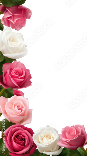 rose, pink rose, white rose, green leaf, floral arrangement, vibrant, delicate, foreground, vivid colors, elegant, polished, high-end, cut-out, isolated