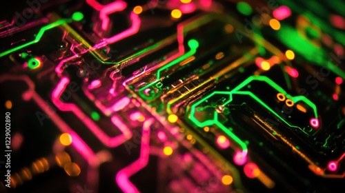 Close-up of vibrant pink, green, and orange circuit board pathways.