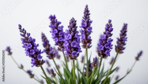 Close-up of vibrant purple lavender flowers against a light gray background. The image showcases the delicate details of the blossoms and their slender stems.