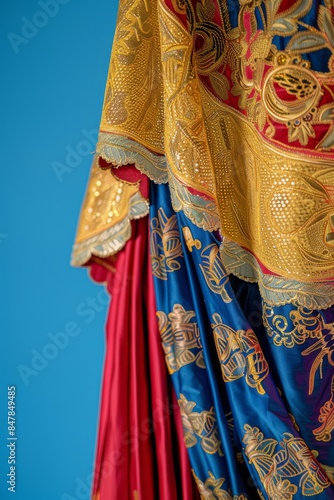 Close-up of vibrant traditional fabric with intricate gold embroidery and rich colors, showcasing cultural heritage and craftsmanship.