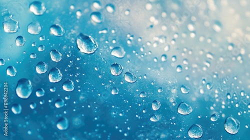 Close-up of water droplets on a blue glass surface with blurred background and Copy Space for text placement.