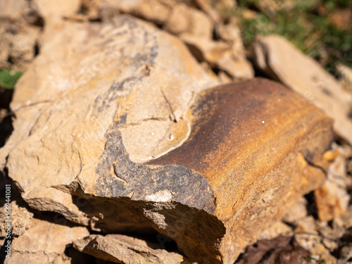 sandstone, rock, stone, geology, fragment, mineral, sedimentary, erosion, quarry, texture, surface, detail, rough, cracked, weathered, natural, brown, orange, earth, ground, excavation, broken, solid, raw, material, mineralogy, dirtied, rugged, hard, structure, small, sharp, rocky, exposed, coarse, sediment