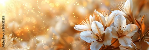 Close-up of white flowers with sparkling bokeh on a golden light background