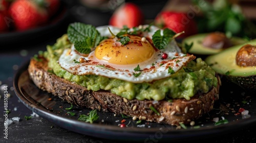 avocado, toast, egg, herb, strawberry, whole grain, rustic, garnished, breakfast, brunch, healthy, food, delicious, alimentary, artistic, modern, contemporary, epicure, culinary, natural, wellness, joy, pleasure, mouth-watering, lifestyle, nourishment, edible, freshness, richness, vintage, hunger, satiety, texture, elegance, appetising, cooked, simplicity, colourful, taste, artisan