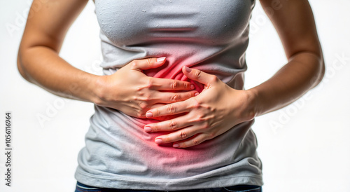 Close-up of woman holding her stomach in pain, experiencing discomfort in light background