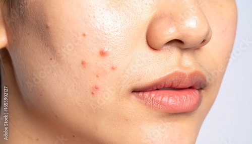 acne, breakout, skin, face, closeup, woman, pimple, blemish, pore, texture, complexion, dermatology, skincare, health, beauty, medicals, treatment, inflammation, redness, close, detail, young, adult, female, cheek, problem, imperfection, irritation, care, solution, prevention, therapy, cosmetic, dermatological, condition, issue, concern, appearance, visual, photo, image, portrait, human, body, well-being, aesthetic, science