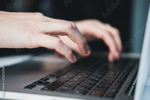 Closeup of woman’s hands working on laptop at office. Business woman concept. Horizontal