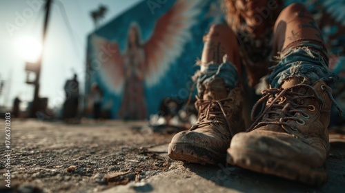 Close-up of worn leather boots resting on concrete ground with graffiti wall behind symbolizing freedom travel and urban wanderer lifestyle in sunlight