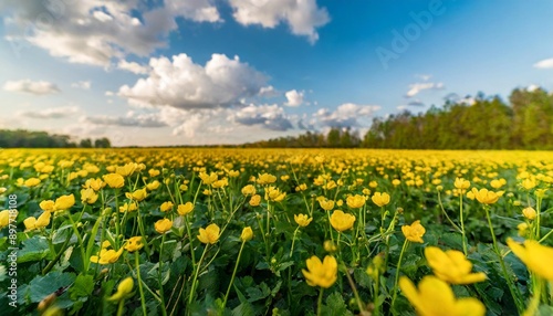 Close-Up of yellow buttercups on meadow against sunlight and blue sky