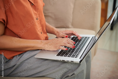online, laptop, typing, home, buy, shopping, order, work, freelancer, indoor, closeup, keyboard, electronic mail, woman, lifestyle, connection, caucasian, sofa, technology, casual clothes, computer, wireless, cyberspace, young, domestic life, living room, comfortable, leisure, businesswoman, business, modern, communication