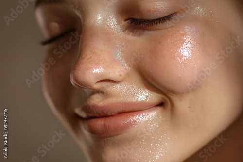 Close-up of young woman's face, eyes closed, gentle smile, natural skin texture, dewy glow, high quality, serene expression, skincare beauty