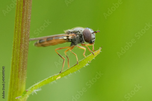 Closeup on a European Variable duskyface fly, Melanostoma mellinum, sitting in the vegetation