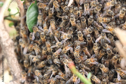 Closeup on bees on a bush.