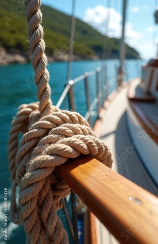rope, coiled, knot, tied, sailboat, yacht, ship, vessel, boat, sea, ocean, water, nautical, maritime, marin, sailing, journey, voyage, mooring, rigging, deck, wood, railing, equipment, line, coarse, thick, beige, tan, adventure, travel, transport, leisure, vacation, summer, coastal, blue, green, hill, scenic, closeup, texture, detail