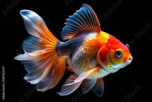 Close-Up Panoramic Photography of an Oranda Goldfish Isolated on Clear Background, Showcasing Its Vibrant Colors and Unique Features for Aquatic Nature Enthusiasts