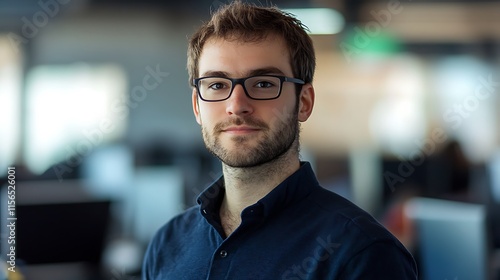 Close-up Photo: Confident Young Man Smiling Gently in Modern Office Setting. AI Generated