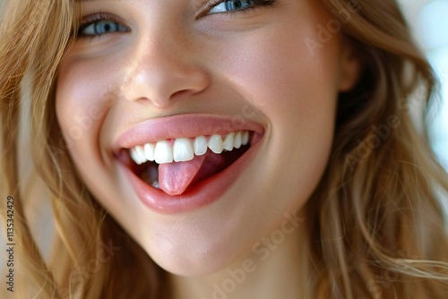 Close-up photo of a woman sticking out her tongue to show off her clean and healthy teeth and lips, with a focus on dental hygiene and healthcare.