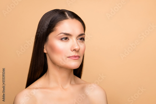 Closeup photo of amazing mature latin lady with perfect skin condition peaceful mood looking empty space natural beauty concept isolated beige pastel color background