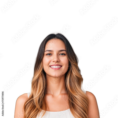 Closeup photo of beautiful smiling caucasian woman with long hair looking at camera. Headshot isolated on a transparent background