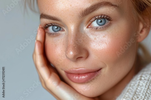 Close-up photo of young woman touching her skin, she applies moisturizing cream balm. Cosmetology, plastic surgery, healthy lifestyle. Radiant skin. Advertising of cream, skin health products