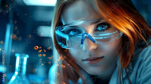 closeup photograph of a smiling girl lab in mask and protection glasses technician in a large modern laboratory who is looking at a solution in a flask