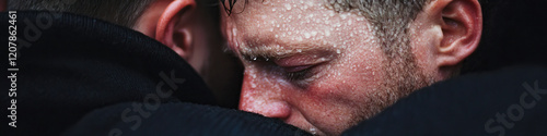 man, hugs, sweating, closeup, perspiration, face, dark, clothing, mood, emotion, distress, man, hug, head, shoulder, hair, beard, skin, ear, eye, texture, portrait, photo, image, close, detailed