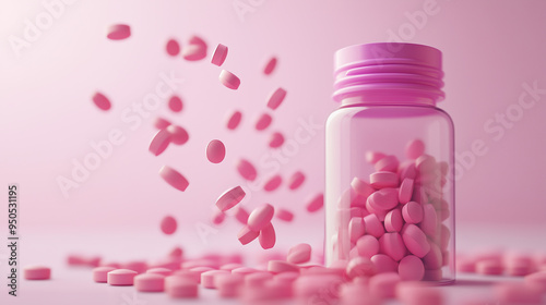 Close-Up Pink Pills and Bottle on Pink. Close-up of pink pills spilling from bottle on pink background, suitable for health and wellness themes.