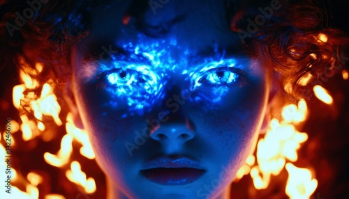 portrait, face, eye, glowing, fire, light, energy, abstract, art, person, closeup, expression, dark, moody, beauty, design, style, creative, colours, texture, neon, pattern, glow, blue, orange, fiery, dramatic, sharpened, image, photo, visual, effect, modern, youth, fashion, make-up, studio, lighting, artistic, digital, technology, youthful, mysterious, intense