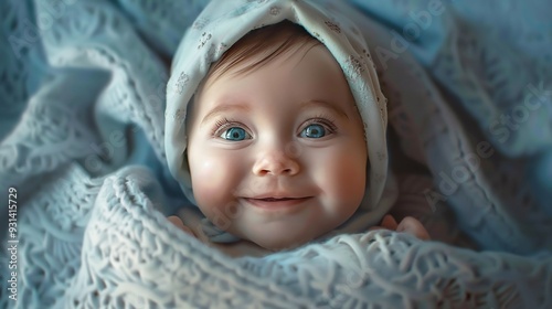 baby, girl, portrait, eye, blue, blanket, smiling, happy, infant, childhood, innocence, sweet, cute, adorable, small, tiny, delicate, soft, fuzzy, warm, cosy, peaceful, pure, precious, love, joy, tender, gentle, expression, face, feature, skin, hair, brow, lash, mouth, teeth, hand, finger, light, shadow, warmth, sharpened, blurred, background, texture, pattern
