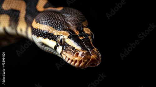 snake, ball, python, reptile, scale, pet, animal, wild, closeup, macro, portrait, head, eye, wildlife, nature, reptilian, exotic, crawling, pattern, skin, venomous, dangerous, black, yellow, brown, dark, colours, background, sharpened, sharp, photo, isolated, studio, fauna, zoology, biology, domesticated, snake, herpetology