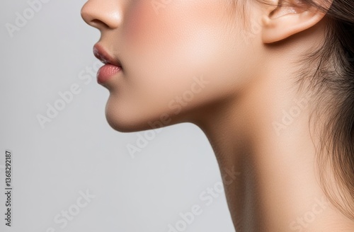 Close-up portrait of a beautiful Asian woman with clean, fresh skin on a white background, in profile. This image represents the beauty concept for women's face care and cosmetics advertising,