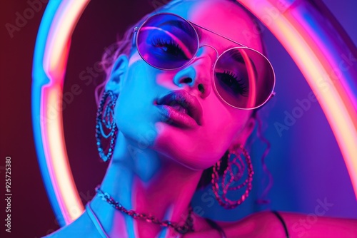 Close-up portrait of a beautiful woman in neon light. Studio shot.