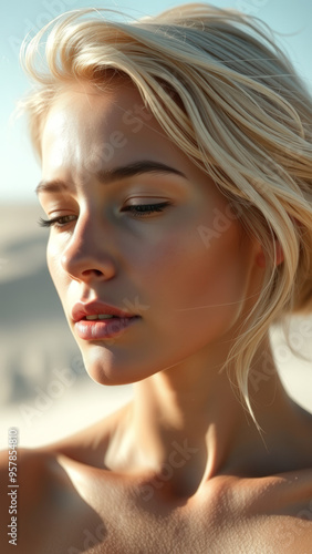 Close-up portrait of a beautiful young woman with blonde hair and flawless skin