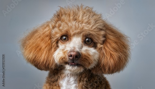 Closeup Portrait of a Brown Toy Poodle on Gray Studio Background, Striking Expression and Warm Eyes Captivating Viewers with a Playful Atmosphere